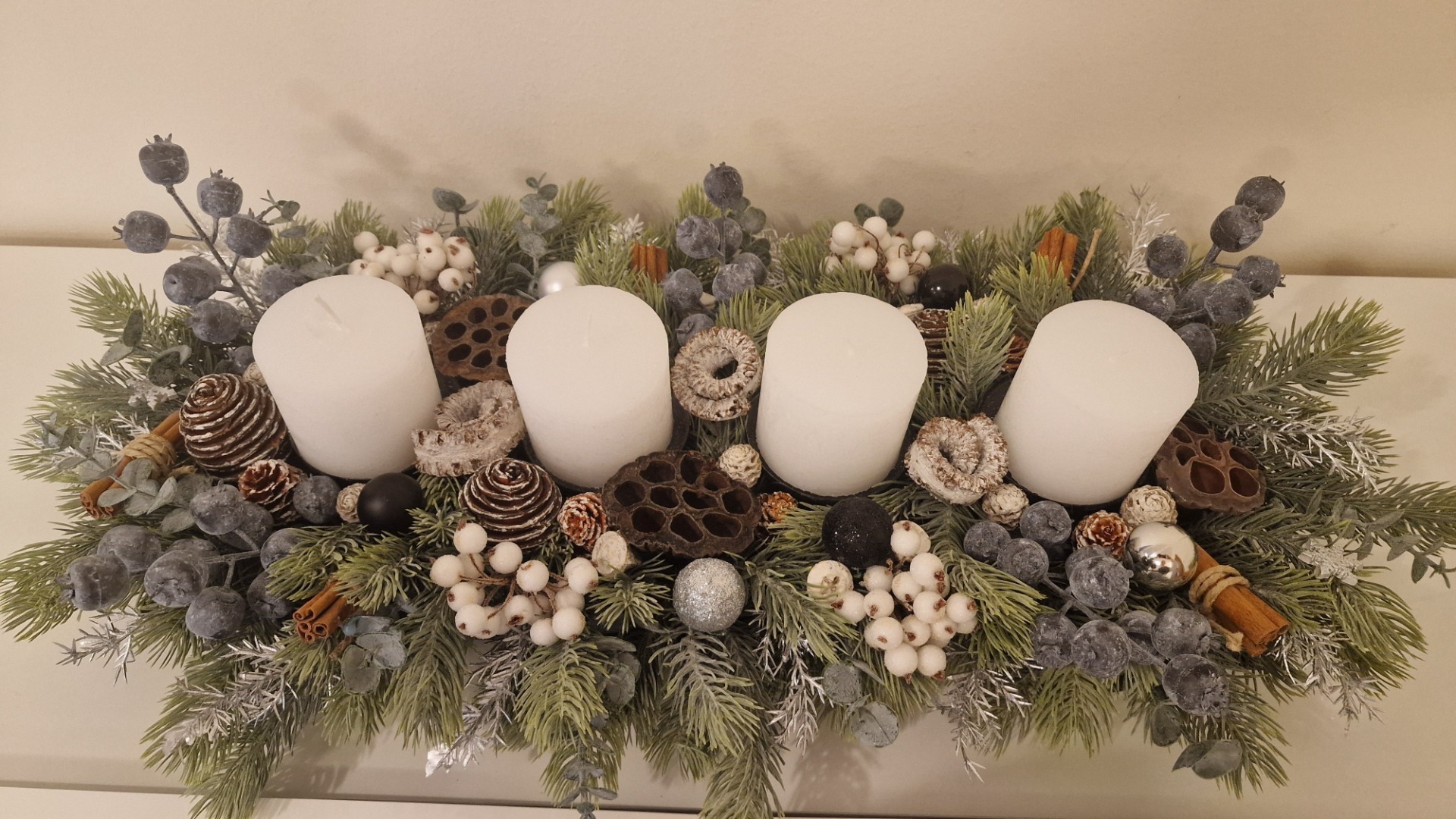 Természetes színekben pompázó, élethű fenyővel, száraz termésekkel gazdagon díszített, örök adventi koszorú megbolondítva némi ezüstel. A gyertyák cserélhetők. Egyedi kézműves termék.
