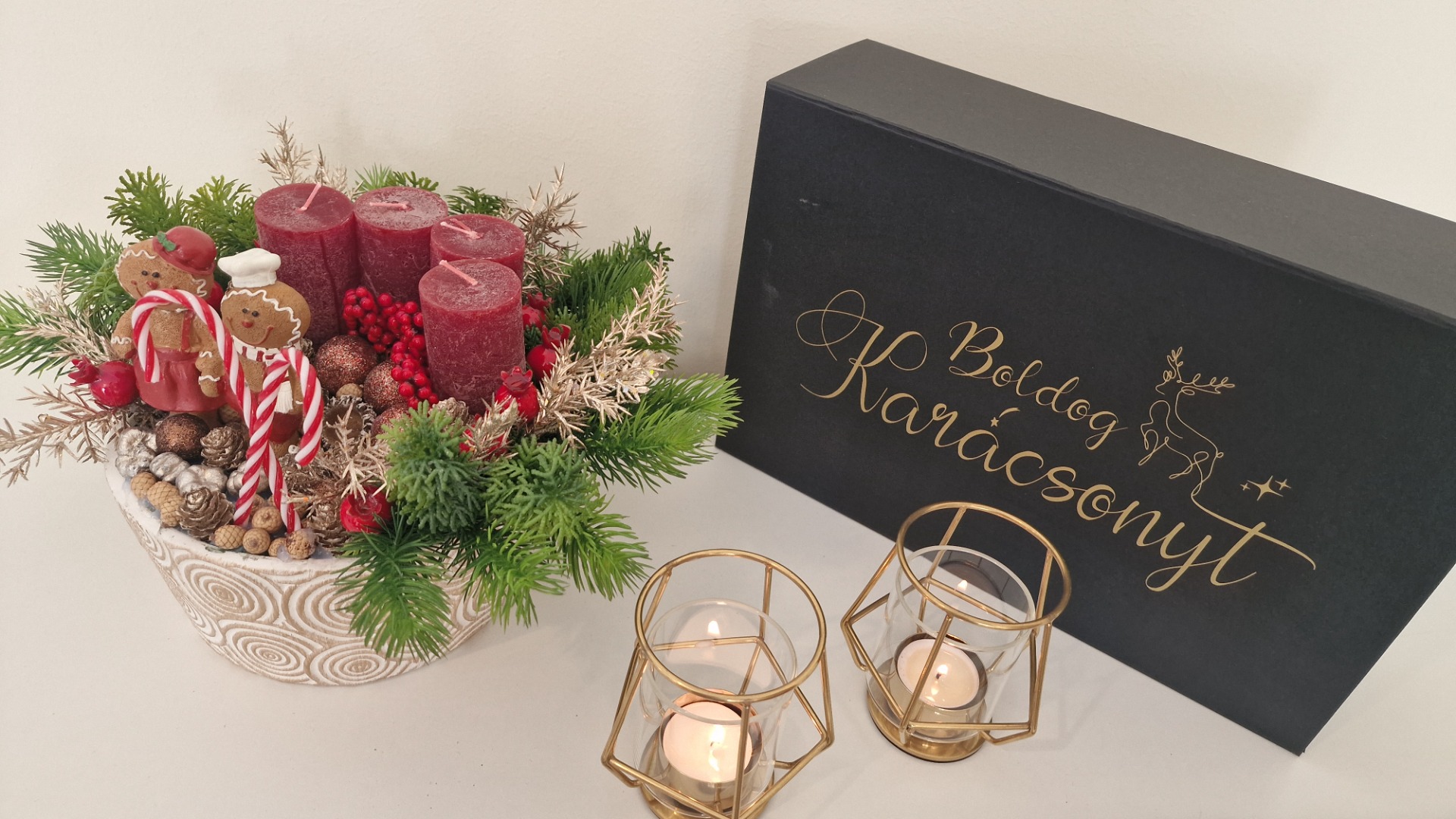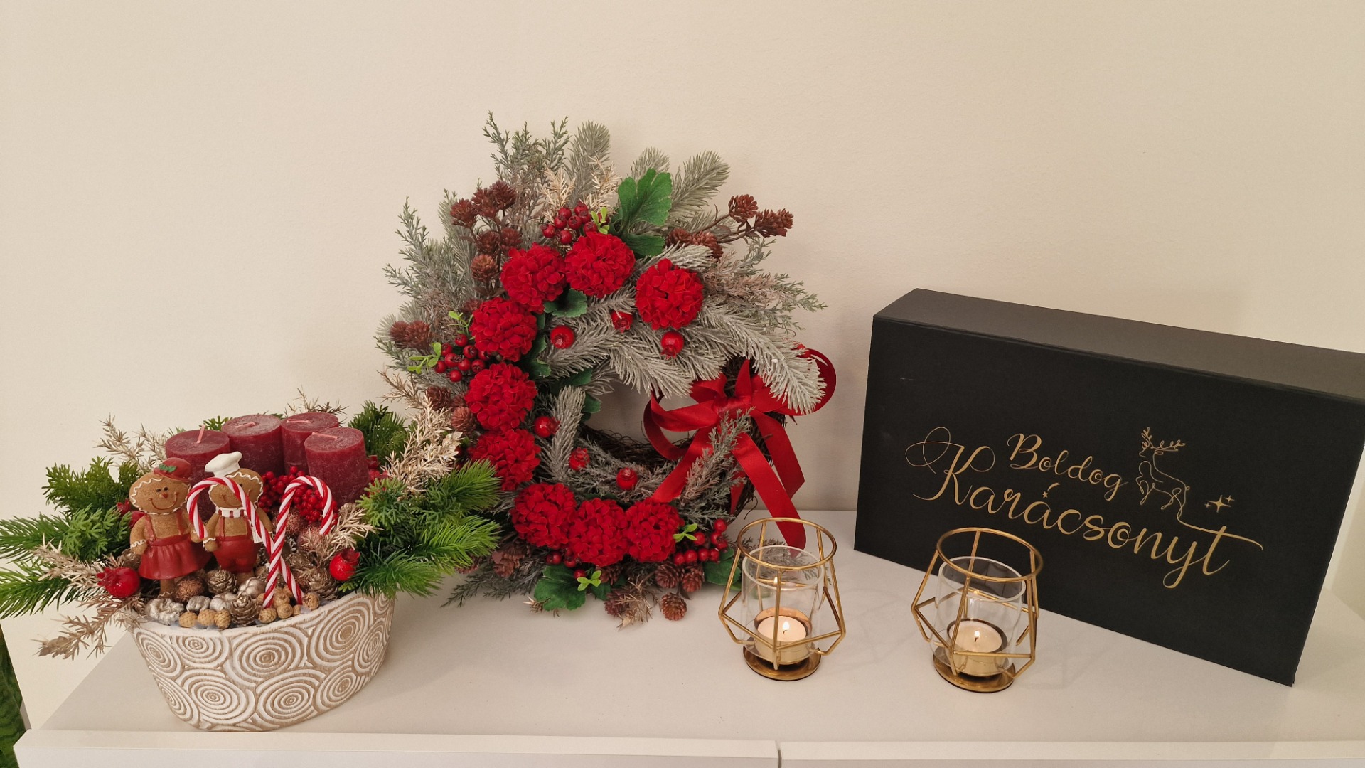 Az asztali dísz egy gipsz kaspóba került megépítésre, melynek átmérője 16 cm. A dísz magassága: 35 cm, átmérője 30 cm. Színeiben arany, vörös és zöld dominál. Minőségi anyagokból készült, egyedi, kézműves termék.