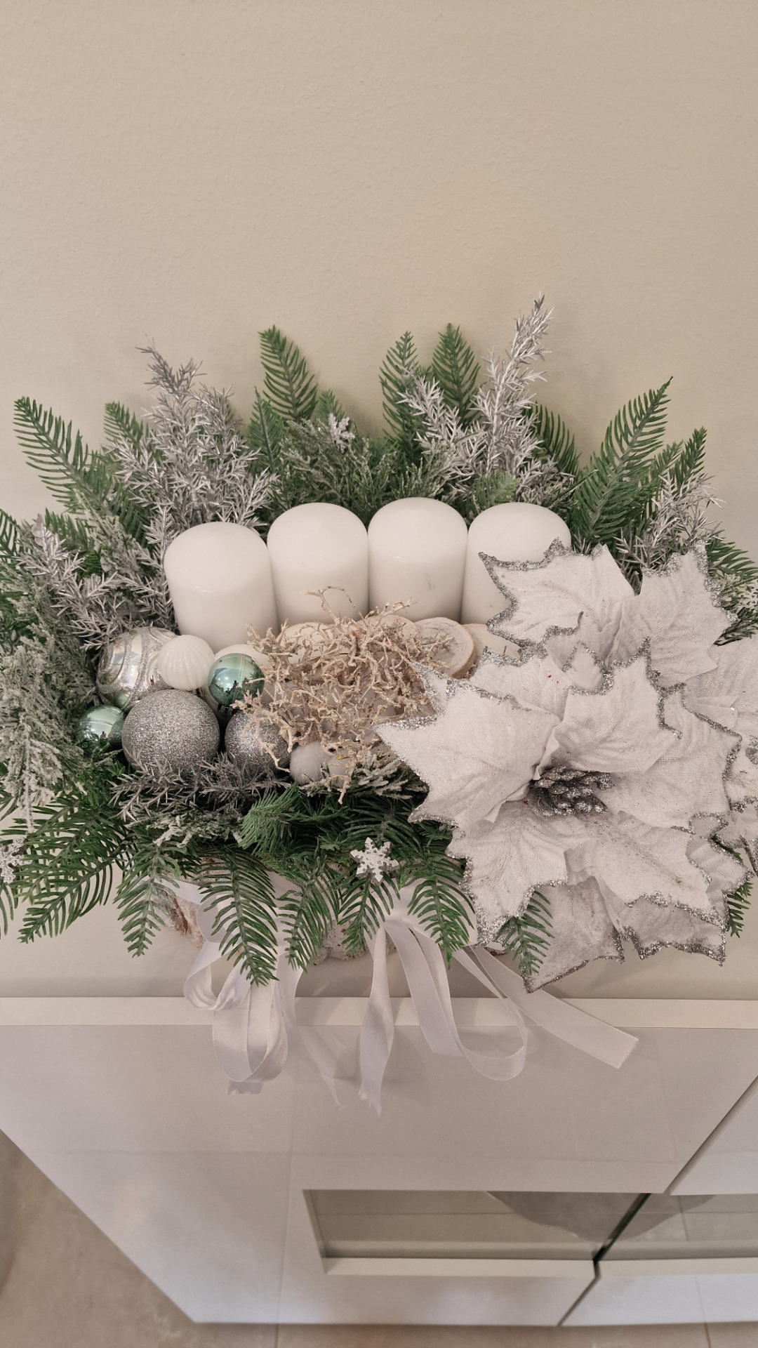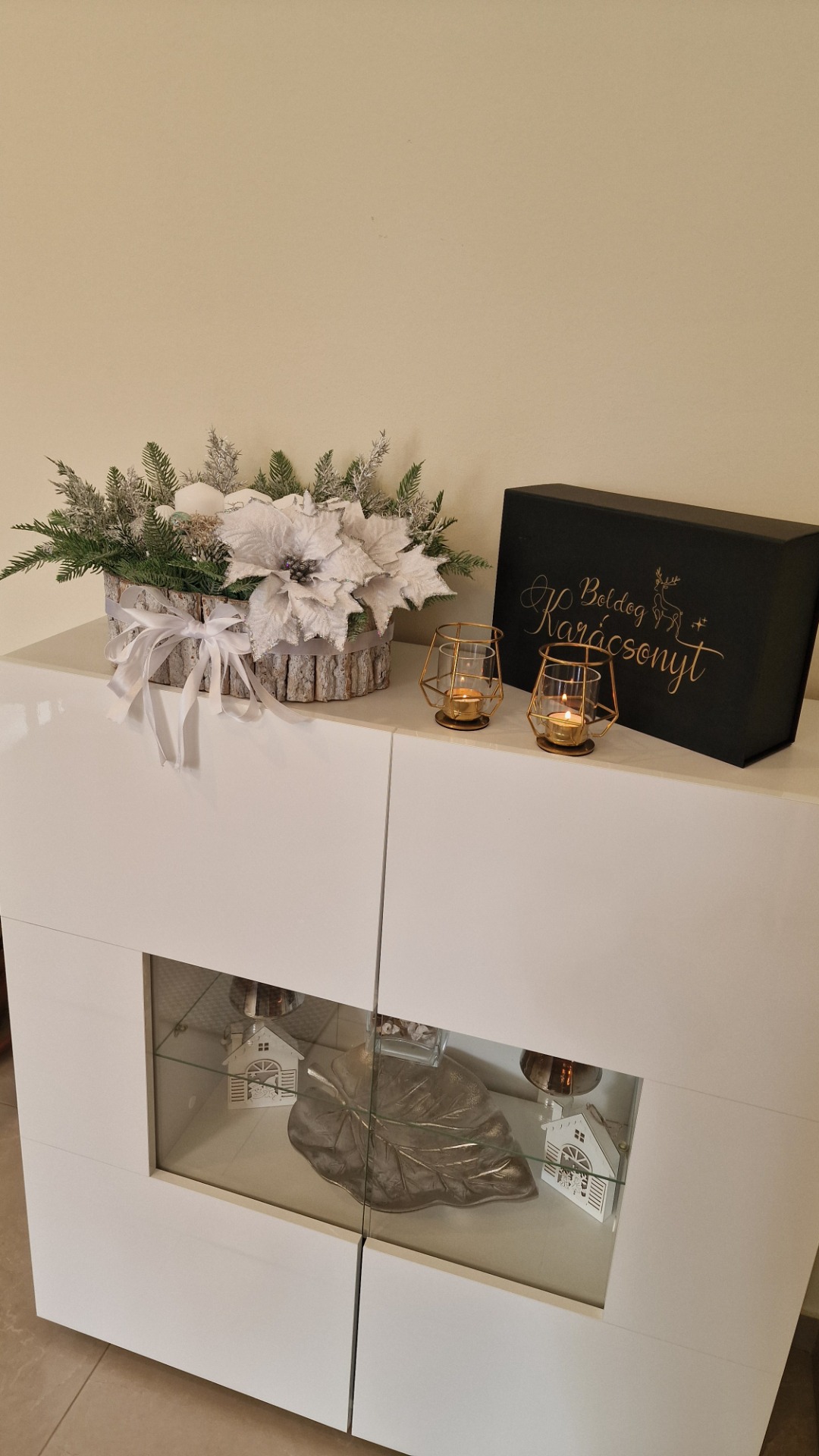 Az asztali dísz dobozának méretei: sz: 25 cm, h: 35 cm, anyaga: fakéreg. A dísz magassága: 25 cm. Színeiben fehér, ezüst és a zöld dominál, 4 db fehér gyertyát tartalmaz.