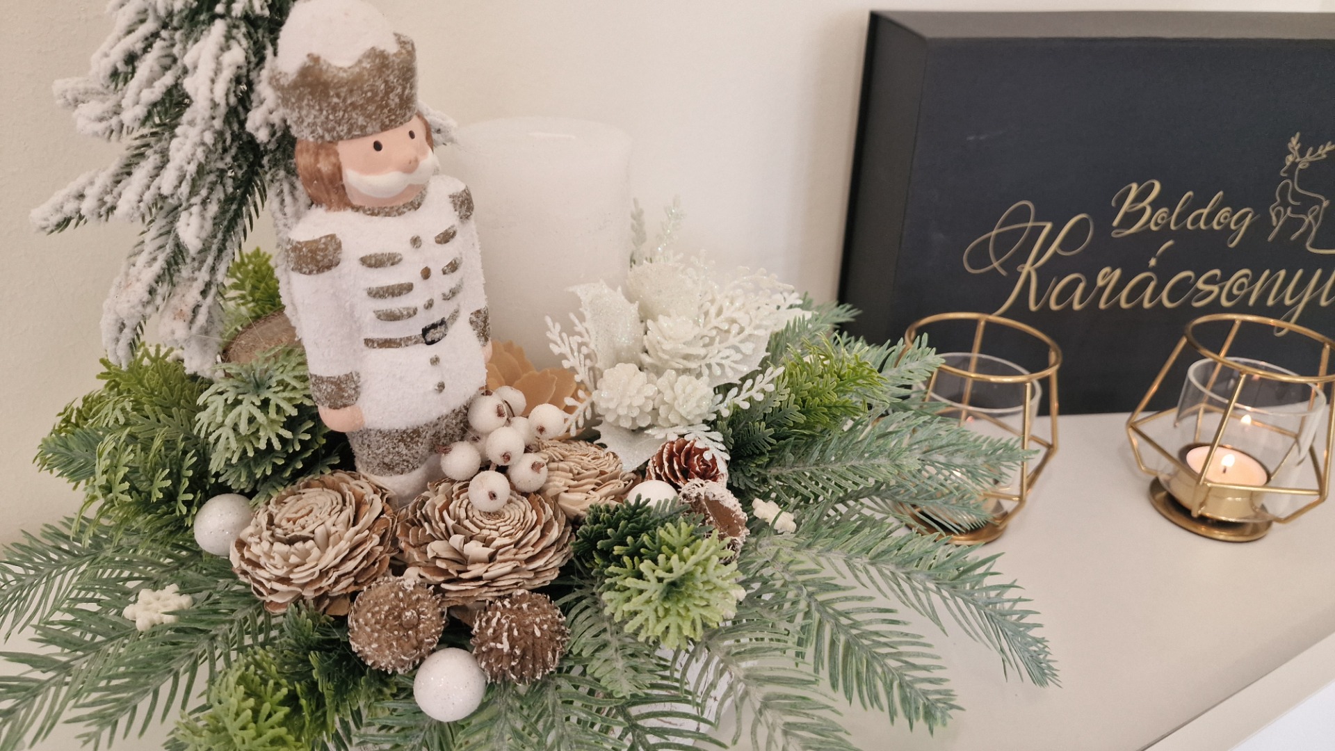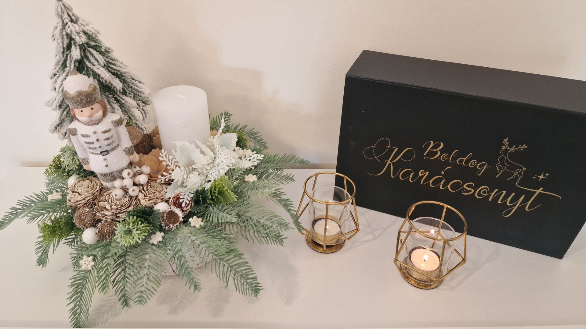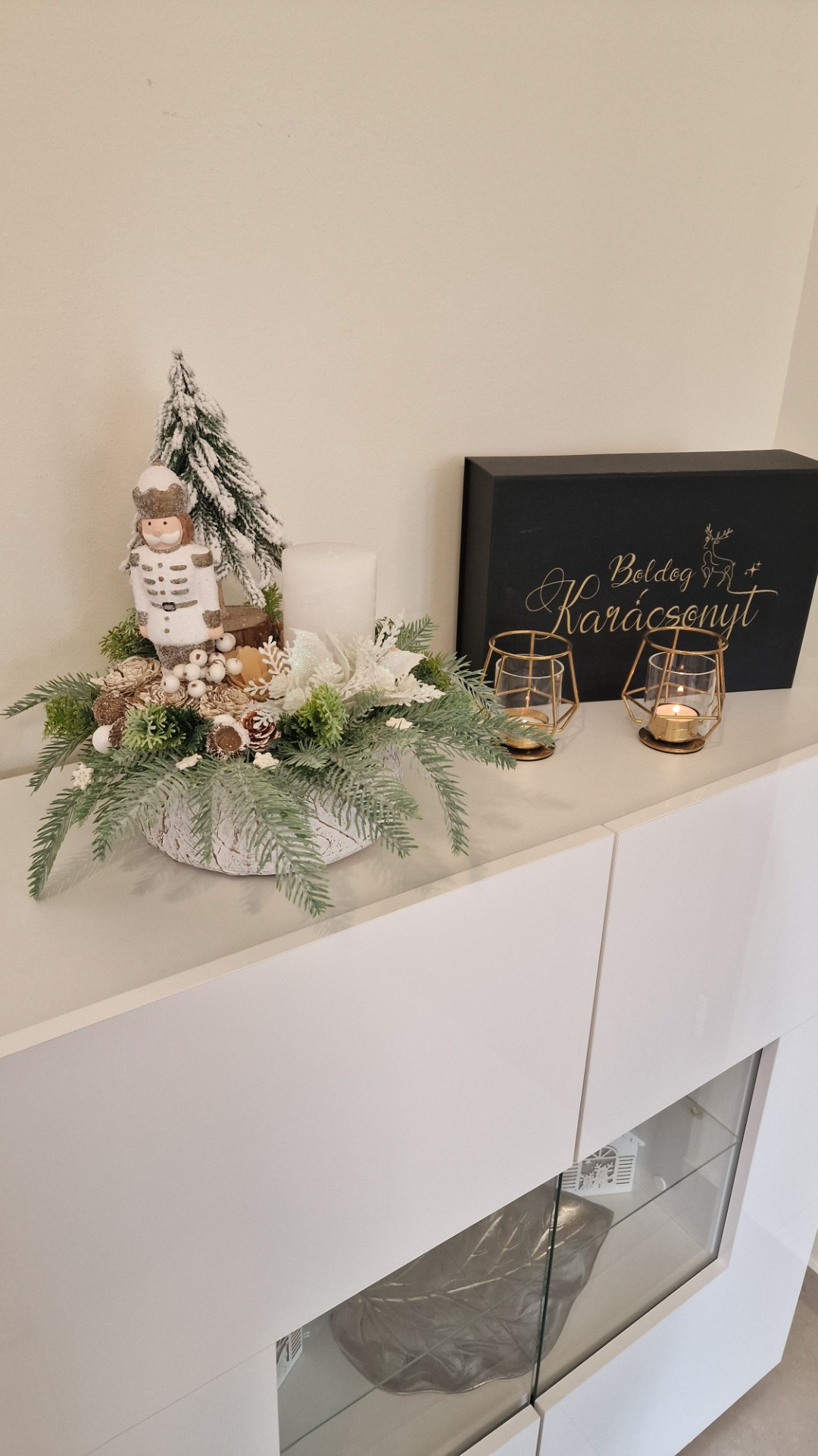 Az asztali dísz egy cementkaspóba került megépítésre, melynek átmérője 20 cm. A dísz magassága: 35 cm, átmérője 35 cm. Színeiben barna, natúr, pezsgő és a zöld dominál. Minőségi anyagokból készült, egyedi, kézműves termék.