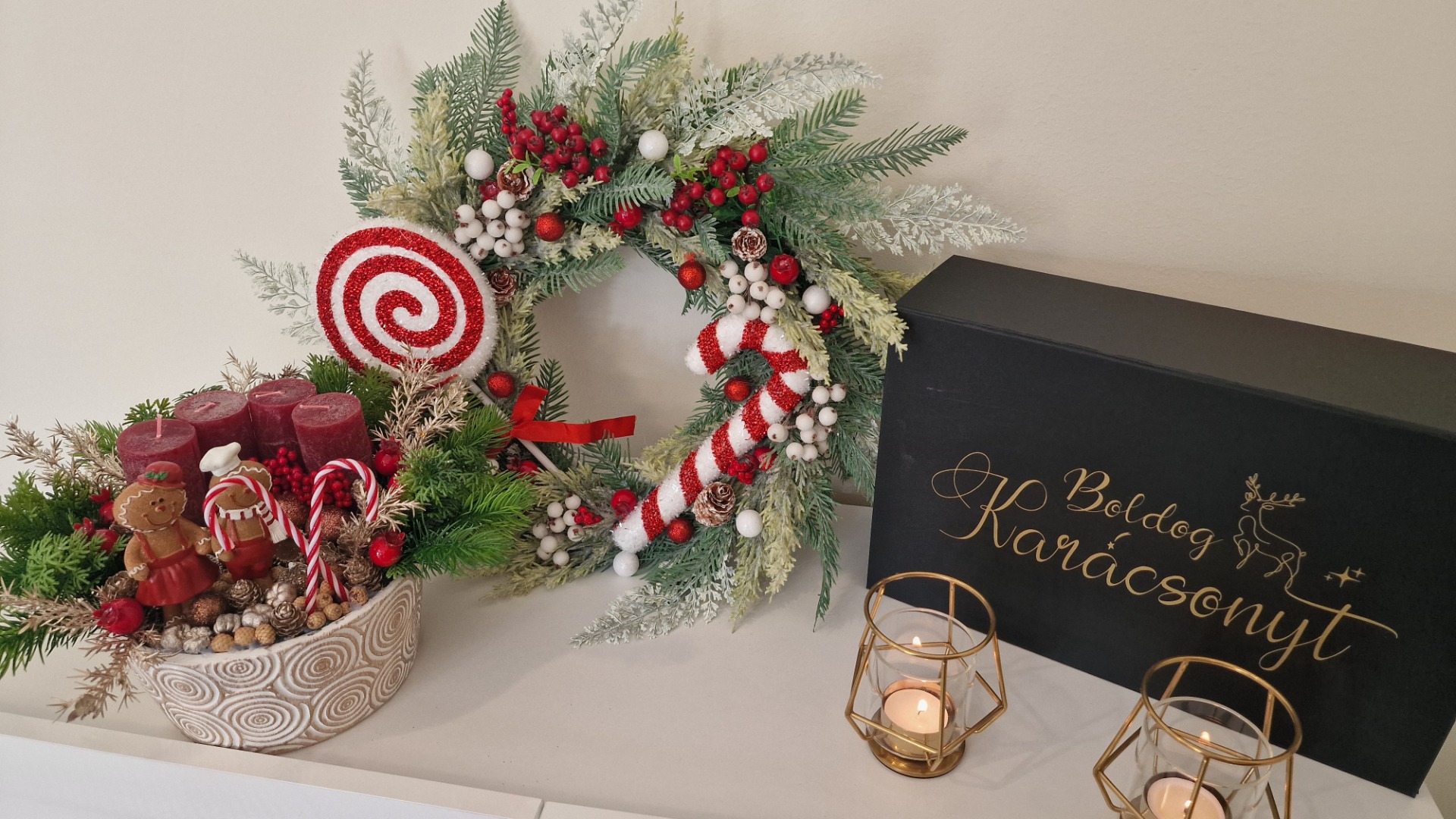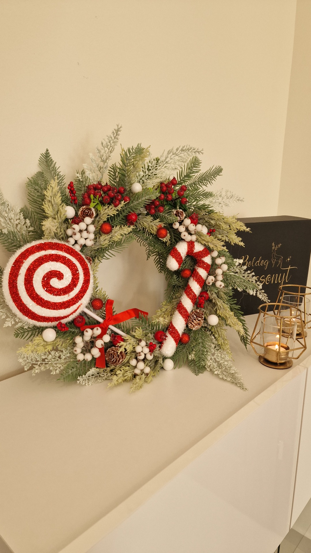 A kopogtató egy fehér vesszőkoszorú alapra került megépítésre, melynek átmérője 30 cm. Színeiben piros, zöld és fehér dominál. Minőségi anyagokból készült, egyedi, kézműves termék.